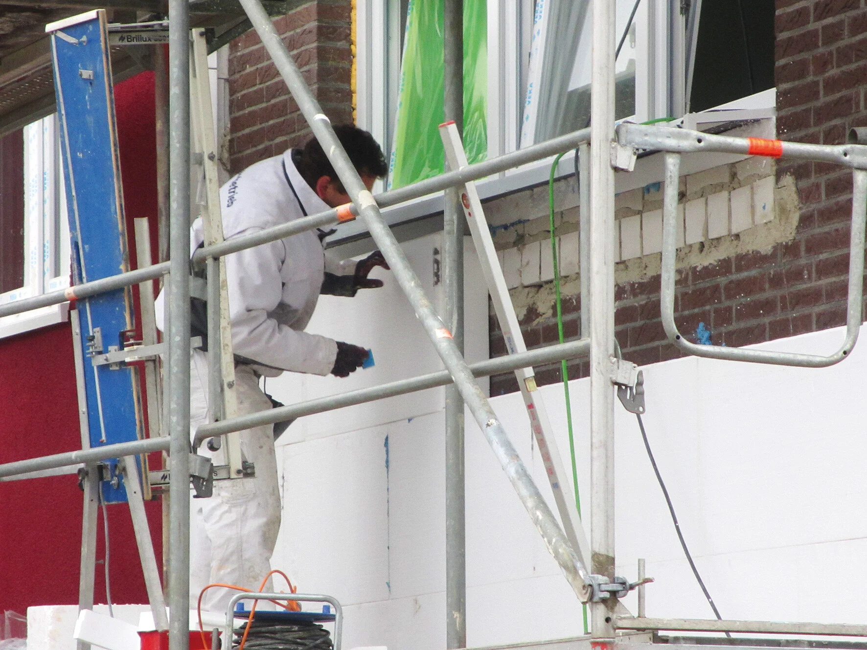 –ein WDVS besteht aus den komponenten dämmstoff, armierung und schlussbeschichtung, die fachmännisch verbunden werden. hier sieht man die teilfertigstellung einer dämmfassade auf klinker.